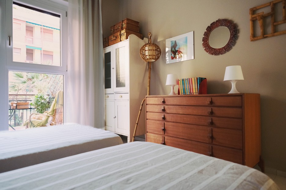 The second bedroom overlooks the peaceful interior garden and has its own sunny balcony—perfect for starting your day with morning coffee in the sun.