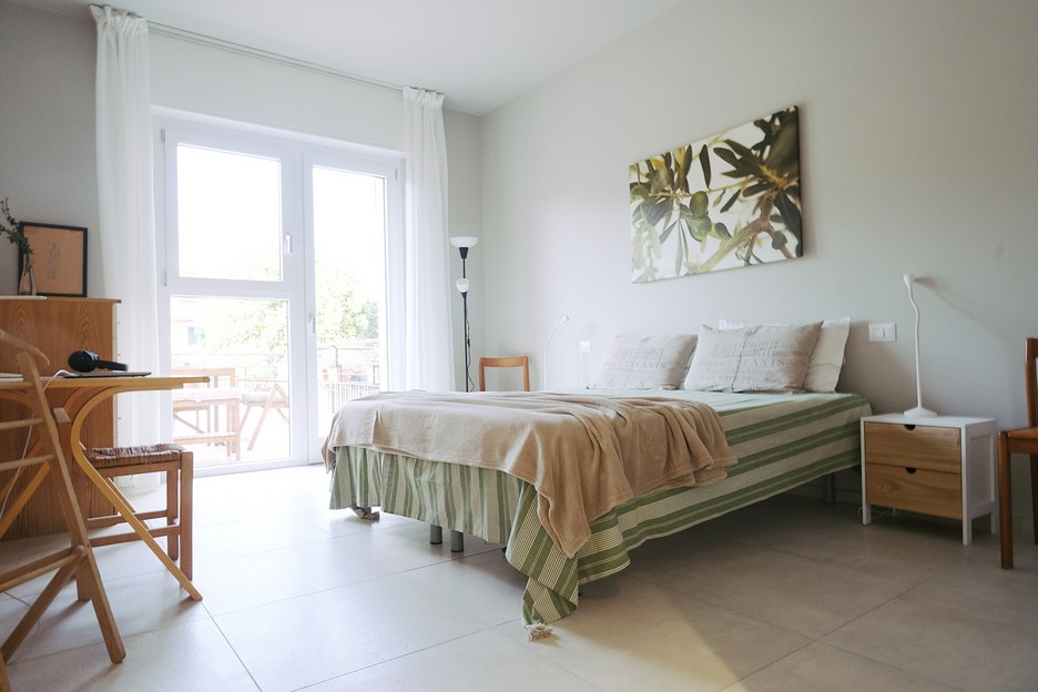 The main bedroom opens directly onto the large terrace, shared with the living room.